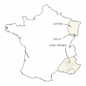 Le design des tricots et le tricotage se fait en région Grand Est à Belfort. La Couture se fait à Essey lès Nancy en Meurthe et Moselle.